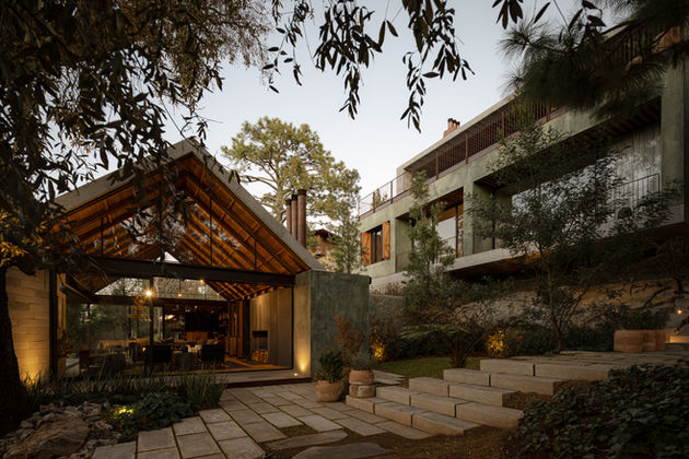 La lluvia generosa en el temporal hizo necesario colocar techumbres a dos aguas que además dotan del carácter de la región al proyecto junto con la materialidad seleccionada considerando la colorimetría del paisaje y sus texturas haciendo así a la casa muy congruente con su contexto.